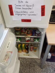Wir haben auch den Kühlschrank umgestellt und beschriftet: Habt ihr Sachen, die ihr für alle bereitstellen wollt? Einfach in das Fach “Alles für Alle” stellen. Wollt ihr eure Sachen kurz zwischenlagern? dann schreibt bitte Name und Datum drauf – ansonsten wirds weggegessen/geschmissen 😉