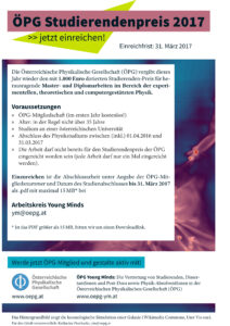 Die Österreichische Physikalischen Gesellschaft hat gerade den ÖPG Studierendenpreis für Physik-Master- und Diplomarbeiten (1000 Euro!) ausgeschrieben. Die Einreichung ist relativ einfach (nur ein PDF der Arbeit per Mail schicken) und es ist eine gute Gelegenheit, schon zu Beginn der wissenschaftlichen Karriere Anerkennung für seine Arbeit zu bekommen.